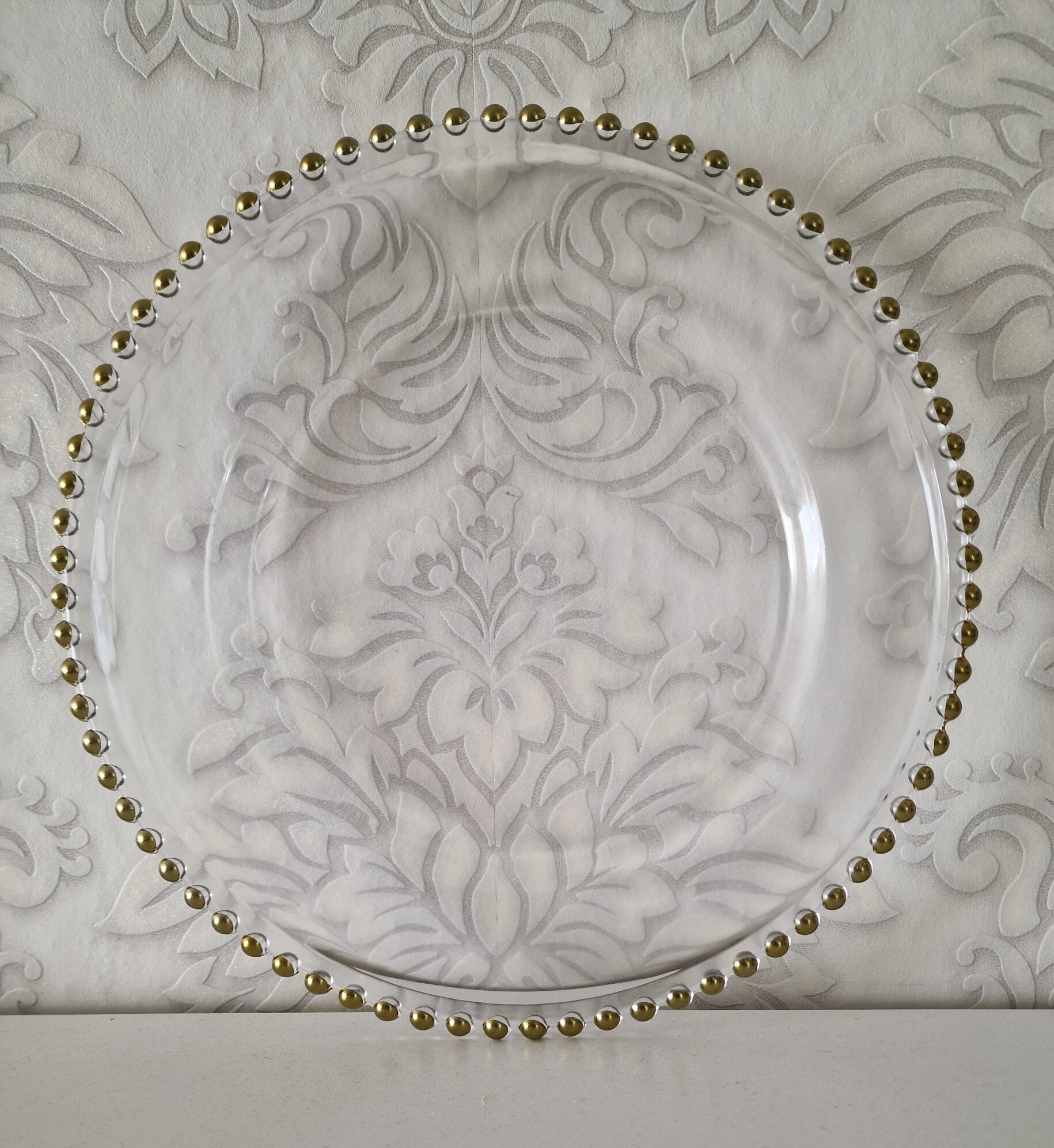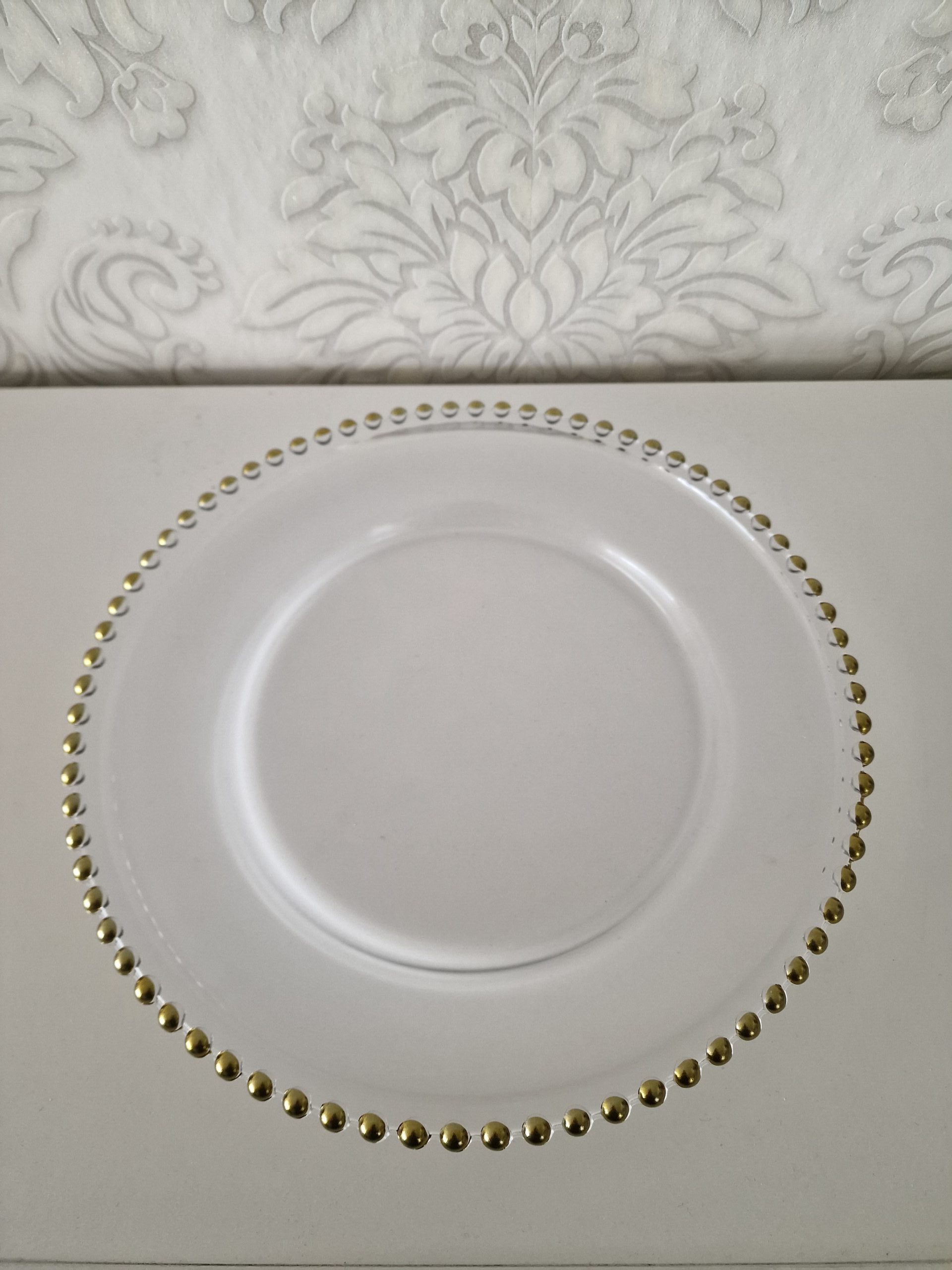 Verleihe deiner Tischdekoration einen Hauch von Eleganz – mit unserem edlen Platzteller aus Glas (Ø 32 cm) mit stilvoll eingearbeiteten Goldperlen am Rand.